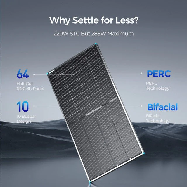 Renogy's latest innovative 220W bifacial solar panel is among the best solar panels for marine and RV applications, offering up to 30% higher energy output than traditional solar panels thanks to its bifacial design that captures sunlight from both sides. Featuring premium Grade A+ monocrystalline solar cells, PERC technology, half-cut cells, 10 busbars, and bypass diode network, this monocrystalline solar panel ensures high solar cell efficiency and solar panel output. It is a great option that can provide power even in the toughest environmental conditions.